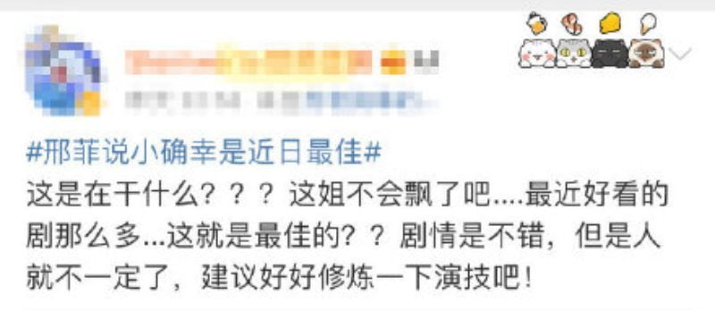 「這是在幹什麼??這姐不會飄了吧…最近好看的劇那麼多….這就是最佳的?劇情是不錯,但是人就不一定了,建議好好修煉一下演技吧!」