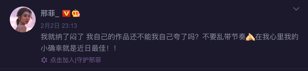 此事引發熱議後,邢菲也發文回應表示:「我就納了悶了 我自己的作品還不能我自己誇了嗎?不要亂帶節奏[作揖]在我心裏我的小確幸就是近日最佳!! 」