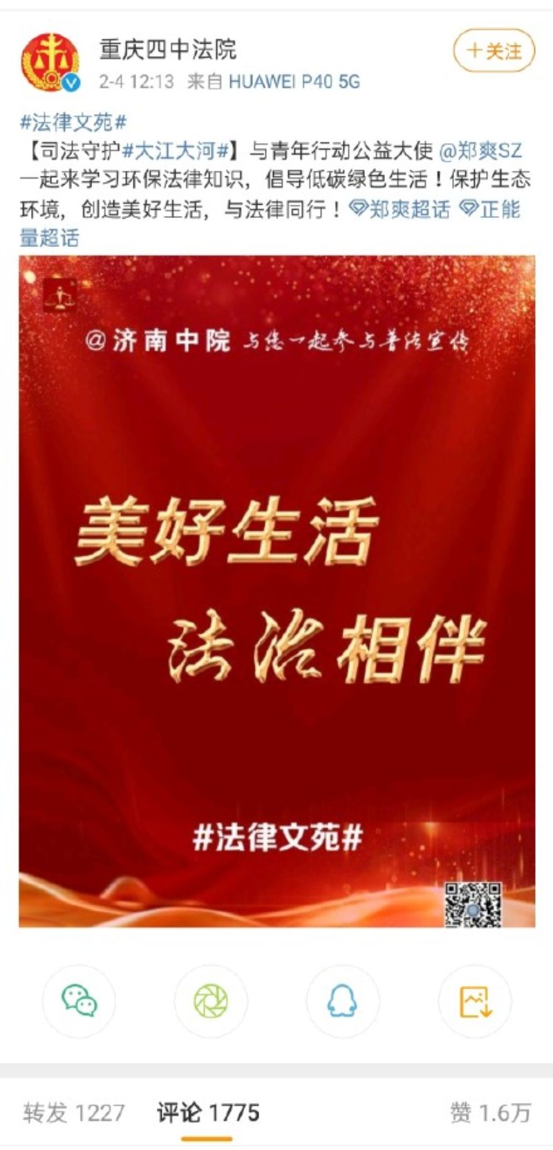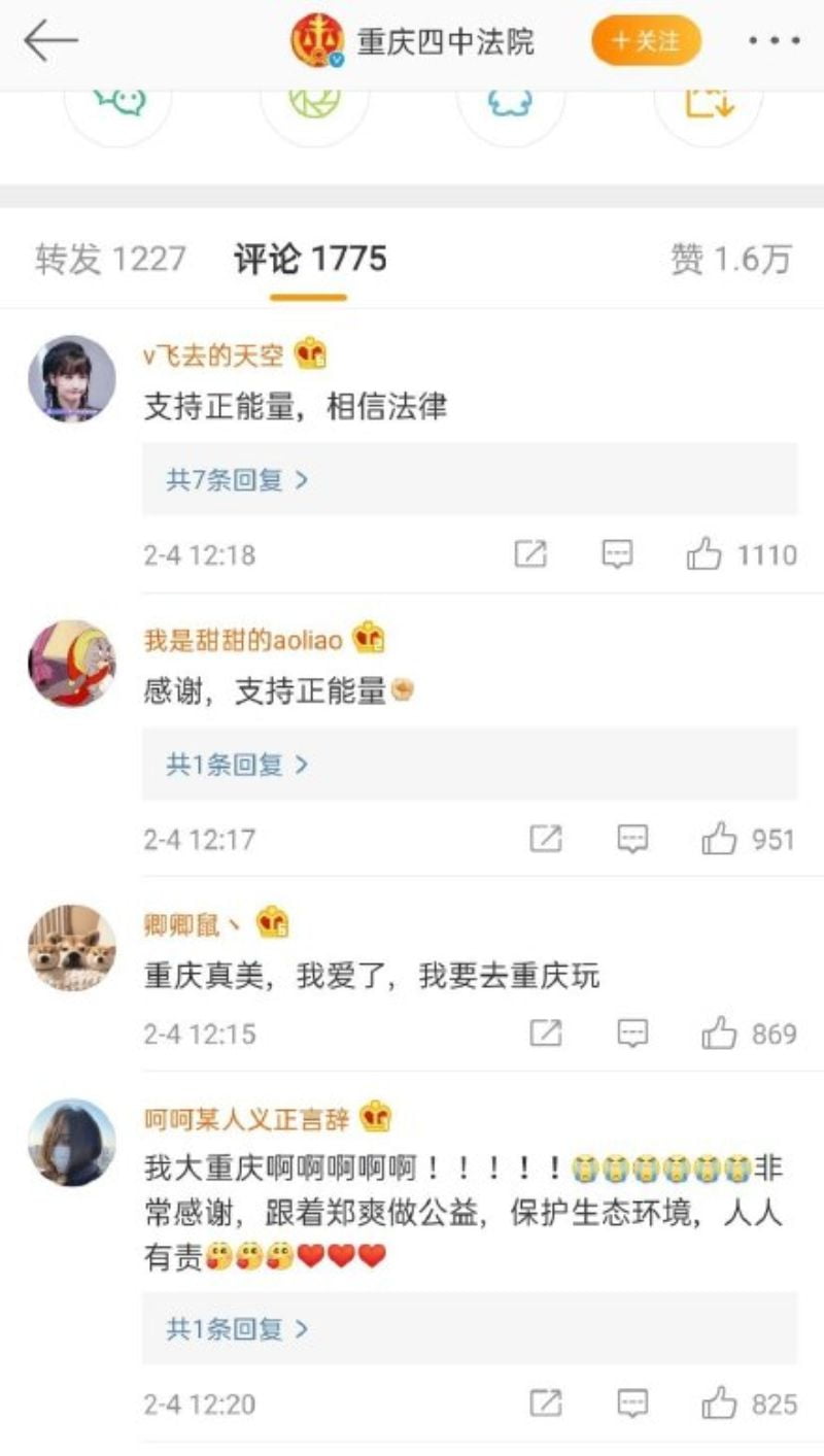 結果沒想到,2月4號中午,濟南中院與重慶四中法院同時發文,稱鄭爽為“青年行動公益大使”,並號召大家和鄭爽一起“保護生態環境,創造美好生活,與法律同行”。