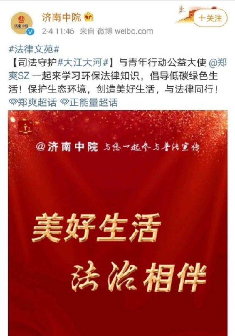 結果沒想到,2月4號中午,濟南中院與重慶四中法院同時發文,稱鄭爽為“青年行動公益大使”,並號召大家和鄭爽一起“保護生態環境,創造美好生活,與法律同行”。