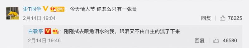 接著一如既往,在評論區和粉絲們開啟了互懟,opps不是,是互動模式~有粉絲問:「今天情人節,你怎麽只有一張票?」白敬亭回復:「剛剛拭去眼角淚水的我,眼淚又不由自主的流了下來。」