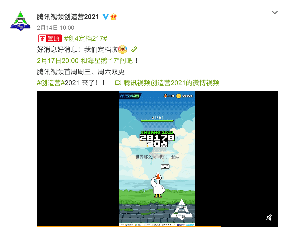 先來看看,創造營2021定檔2月17日晚上8點開播!!騰訊視頻首周周三、周六雙更!