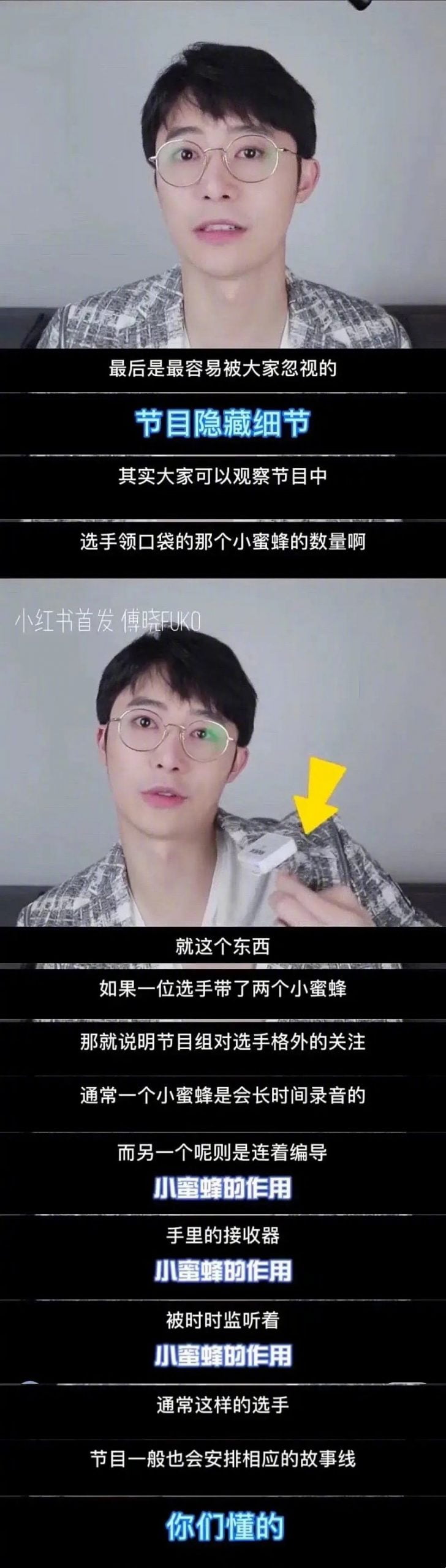119位選手,究竟誰才是應該重點get的呢?根據曾參與青春有你的傅曉提供的tips,有一個很多人忽略的細節,可以讓你知道哪一個才是節目組注重的重點選手!那就是選手領口袋的小蜜蜂(麥克風)數量!只要節目組特別注重的選手,就會佩戴2個小蜜蜂!