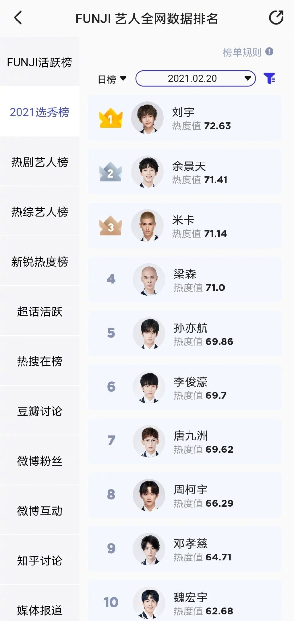是噠!表示《創造營2021》和《青春有你3》同時開播,不管你想不想,相信最近你的首頁滿滿的都是這209個選秀男孩吧!究竟開播一個星期之後,真正出圈的有哪些呢?現在就來看看,由FUNJI數據整理出的,根據熱度值做出的創4青3熱度值總排行榜!究竟現階段出圈的10個男孩,會是哪10個呢?