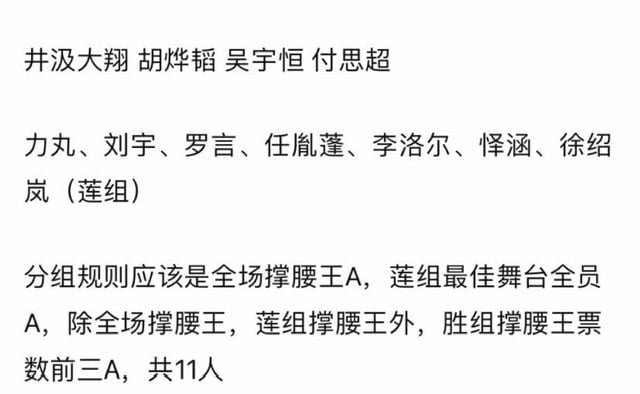 根據爆料網友表示,分組規則是全場撐腰王、蓮組最佳舞台全員A,勝出組撐腰王票數前三,全部11人!
