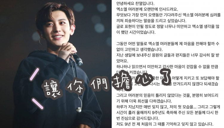 時隔很久才來和EXO-L們問好。 比起其他,最想先對等待了那麼久的EXO-L們說聲抱歉,我讓你們擔心了。