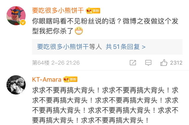 先來看看部分熱評:「你眼瞎嗎看不見粉絲說的話? 微博之夜做這個髮型我把你殺了」、「求求不要再搞大背頭! 求求不要再搞大背頭! 求求不要再搞大背頭! 求求不要再搞大背頭! 求求不要再搞大背頭! 求求不要再搞大背頭! 求求不要再搞大背頭! 求求不要再搞大背頭!」