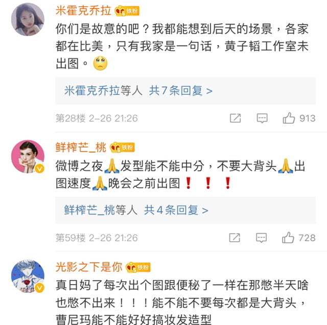 「微博之夜🙏髮型能不能中分,不要大背頭🙏出圖速度🙏晚會之前出圖!!!」、「真日媽了每次出個圖跟便秘了一樣在那憋半天啥也憋不出來! ! ! 能不能不要每次都是大背頭,曹尼瑪能不能好好搞妝髮造型!」