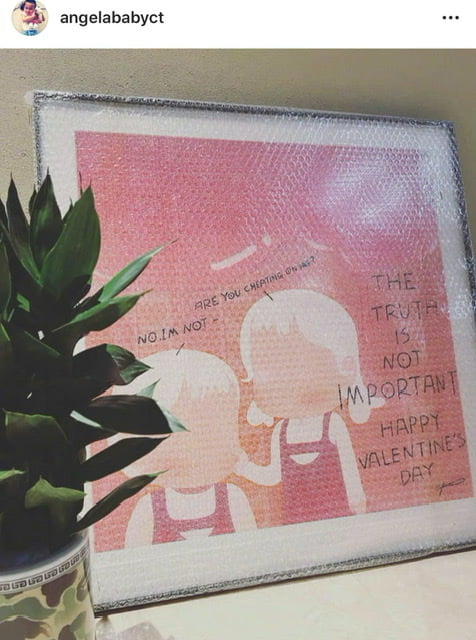 第二張則是小男孩在與小女孩對話。 女孩:「Are you cheating on me?」(你欺騙我嗎?),男孩回答:「No,Im not」(不,我沒有。)。畫中還配文:「真相不重要,情人節快樂。」