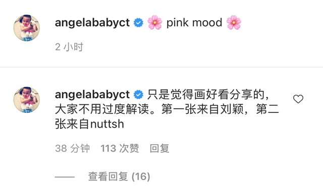 隨著話題發酵之後,Angelababy在評論區回應表示:「只是覺得畫好看分享,大家不用過度解讀。」