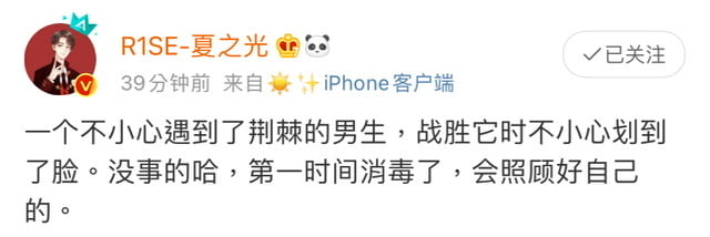 隨著「夏之光面部受傷」衝上熱搜之後,夏之光發文回應表示:「一個不小心遇到了荊棘的男生,戰勝它時不小心劃到了臉。 沒事的哈,第一時間消毒了,會照顧好自己的。」