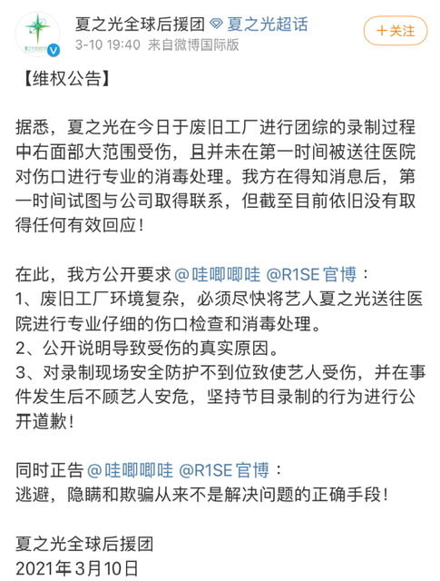 晚間,夏之光全球後援團發布維權公告,稱夏之光今日(10號)在廢舊工廠進行團綜的錄製過程中,右面部大範圍受傷,且並未在第一時間被送往醫院對傷口進行專業的消毒處理,截至目前 依舊沒有取得公司任何有效回應,後援會要求哇唧唧哇道歉並公開藝人受傷原因。