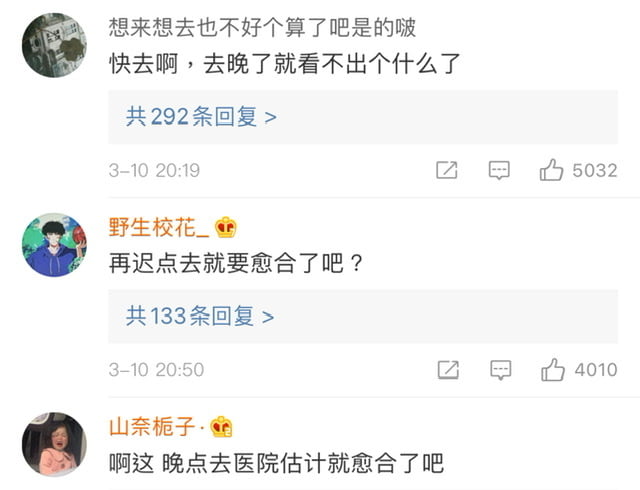 因此路人網友熱評表示:「快去啊,去晚了就看不出個什麼了」、「再遲點去就要癒合了吧?」、「啊這⋯晚點去醫院估計就癒合了吧!」