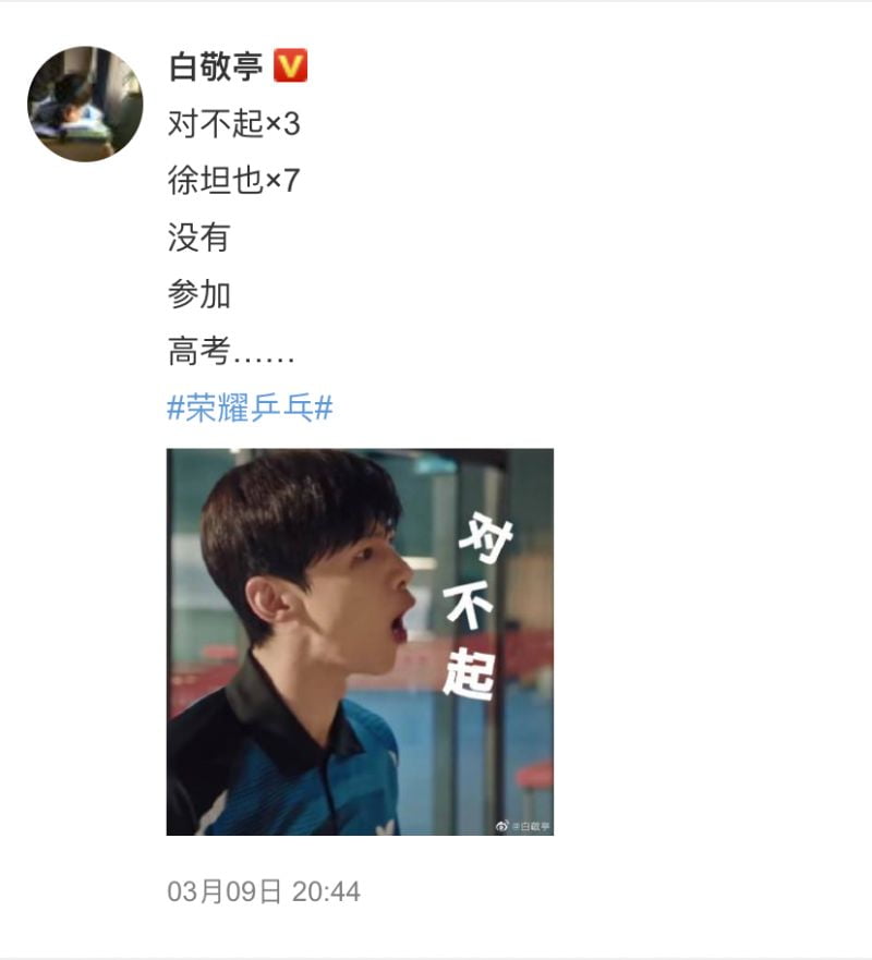 為什麼小白要道歉呢?詳情請看這一篇,會讓你了解小白的高考坎坷之路!笑死!來圍觀白敬亭和胡一天的接戲體質!怎麼能每部戲角色都同樣路線啊!