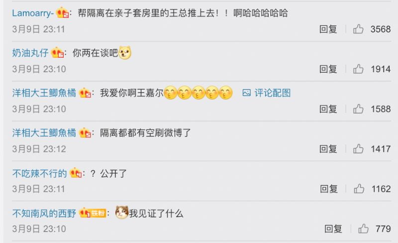 而網友們也湊熱鬧,紛紛在線調侃:「幫隔離在親子套房裏的王總推上去!!啊哈哈哈哈哈」、「你兩在談吧?」、「隔離都都有空刷微博了」、「?公開了」、「[喵喵]我見證了什麽」