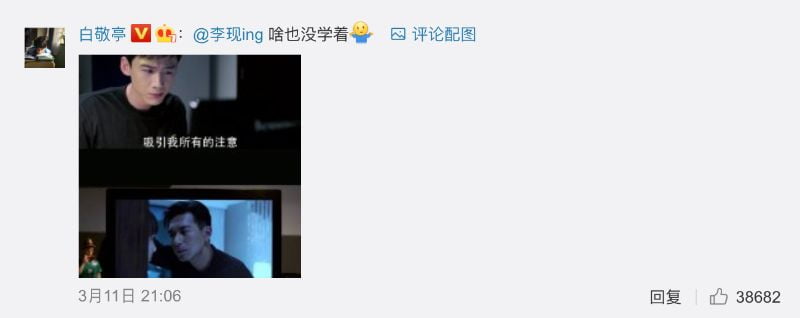 結果沒想到原來他還有文中文,在同一篇貼文下,居然艾特了我們的韓商言,並貼出了自己飾演的邢克壘,在劇中看李現壁咚楊紫的圖,表示:「啥也沒學著。」