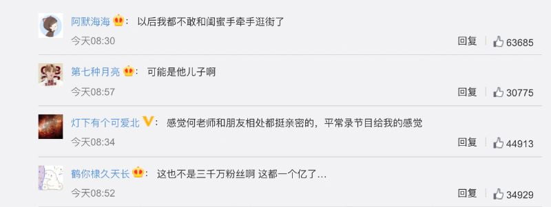 來看看部分熱評:「以後我都不敢和閨蜜手牽手逛街了」、「可能是他兒子啊」、「感覺何老師和朋友相處都挺親密的,平常錄節目給我的感覺」、「這也不是三千萬粉絲啊 這都一個億了…」、「如果是,就祝福。[心]」、「這不是很正常嗎?」