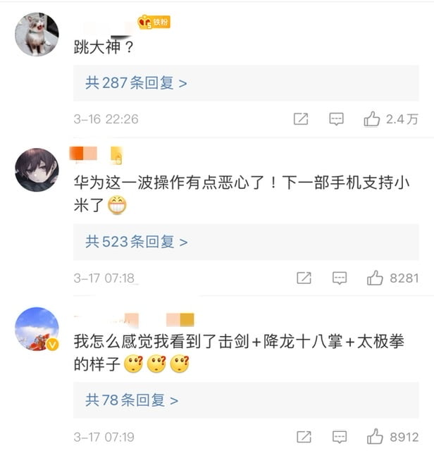 來看看熱評:「跳大神?」、「華為這一波操作有點噁心了! 下一部手機支持小米了[嘻嘻]」、「我怎麼感覺我看到了擊劍+降龍十八掌+太極拳的樣子[疑問][疑問][疑問]」