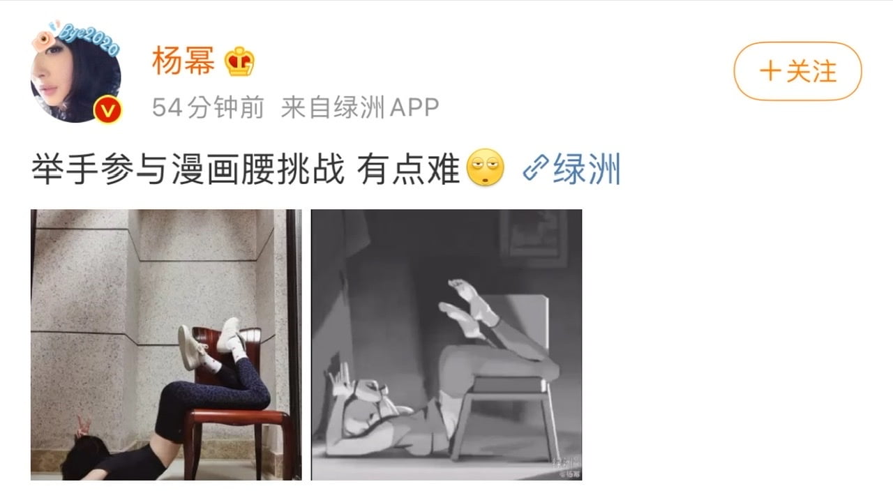 楊冪神還原漫畫腰挑戰!張藝凡也SHOW啦!難度五星!你做得到嗎? 星聞 By 歐巴是我的 On Mar 21, 2021 Share 沒錯!這真的非凡人能所為!表示楊冪更新微博,表示自己舉手參與「漫畫腰」的挑戰!有點難⋯ 小圖看不震撼,點開大圖!原漫畫圖長這樣! 大冪冪神還原! 結果立刻在微博引起跟風熱潮,沒想到張藝凡也來挑戰! 大冪冪微博熱評第一和二,絕對是小編心聲!何止一點難,根本不是凡人所能為⋯ 於是所以,看完之後,小編默默給出掌聲,繼續自暴自棄啃薯片去了! 圖來源:部分照片取自網路,若侵權請告知 楊冪 Share
