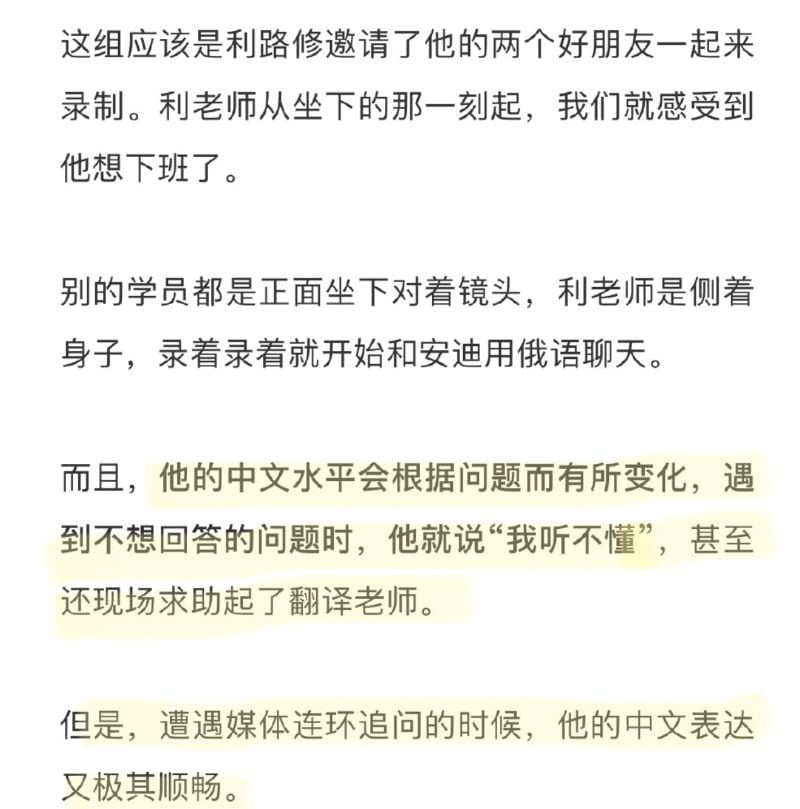 「他的中文水平會根據問題而有所變化,遇到不想回答的問題時,他就說我聽不懂,甚至還現場求助起翻譯老師。但遇到媒體連環追問的時候,他的中文表達有極其通順(好歹修漢語考過了HSK五級)」
