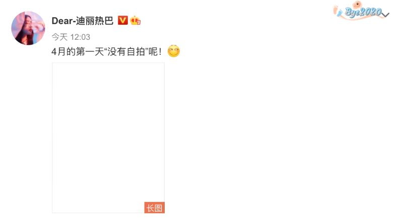 再來…每天說自己不會自拍的迪麗熱巴,居然特地發博,貼了張空白圖配文:「4月的第一天“沒有自拍”呢!」