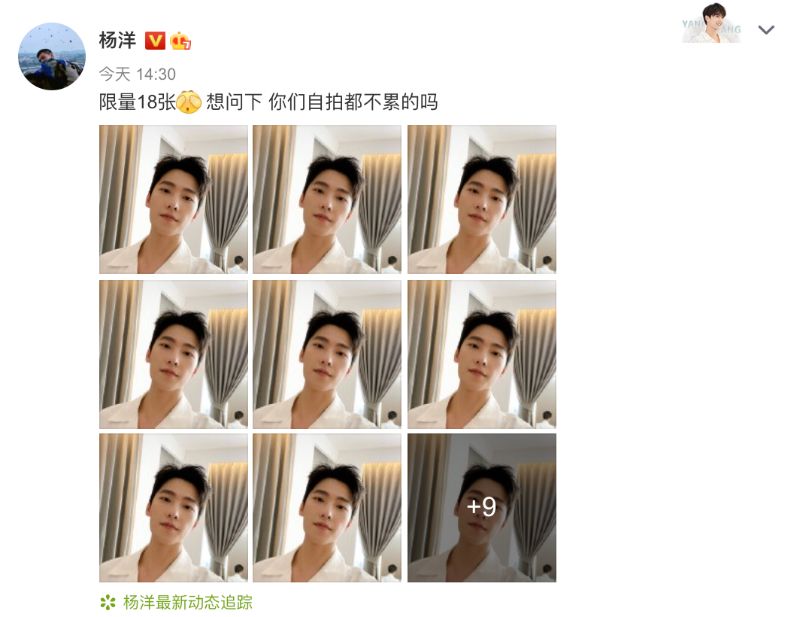 第一個就是N百年沒看過他自拍的楊洋,居然貼了18張貼圖,配文:「限量18張!想問下…你們自拍都不累的嗎?」