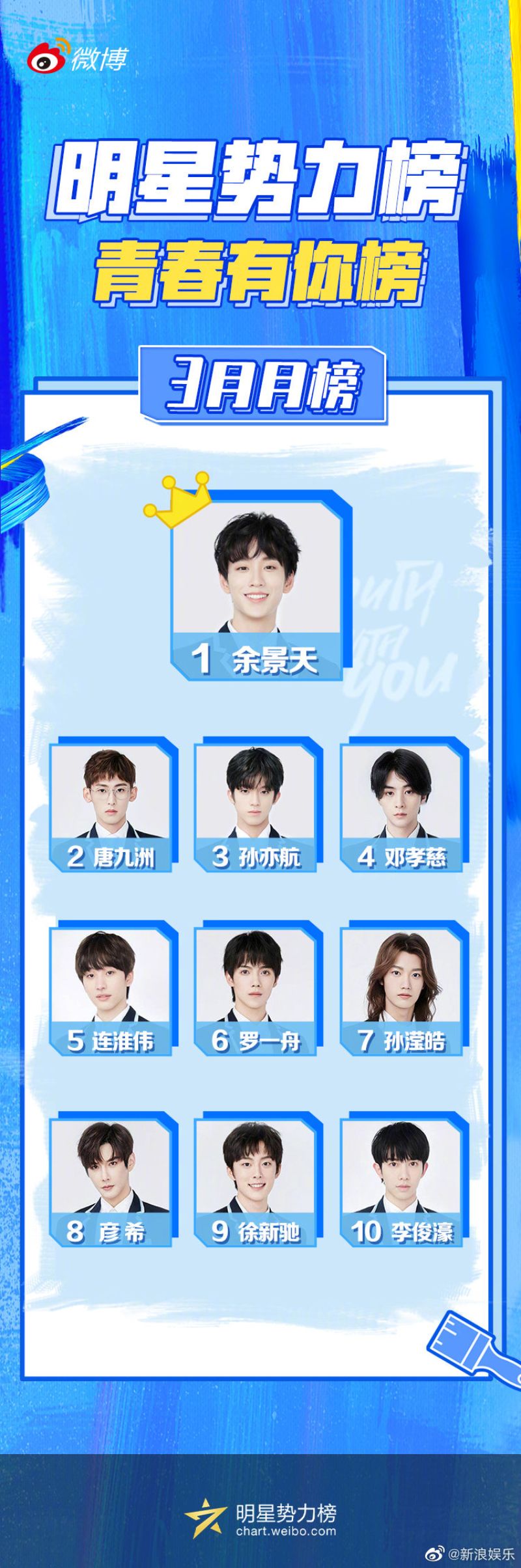 明星勢力榜之青春有你榜,排名順序分別是:余景天榮獲青春有你榜月榜冠軍!接著是唐九洲第二,孫亦航第三,鄧孝慈位列第四,連淮偉第五,羅一舟、孫滢皓、彥希、徐新馳和李俊濠分列第六至第十位。