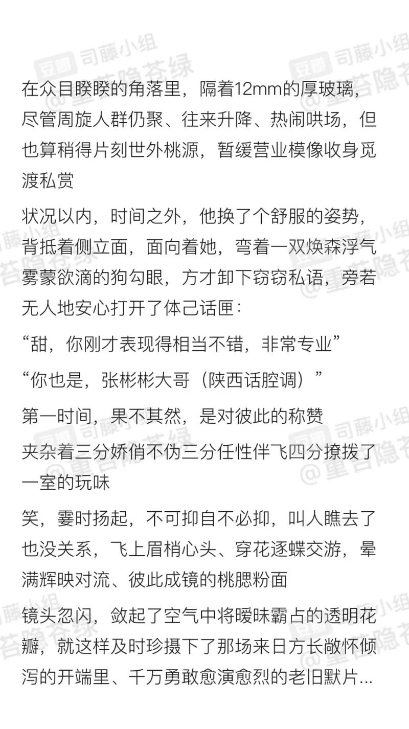 還有網友特地為張彬彬和景甜寫文的:「當然,電梯裏除了憨憨的可愛大狗勾,還有他的女王大人!張彬彬×大甜甜!電梯文學🈶」