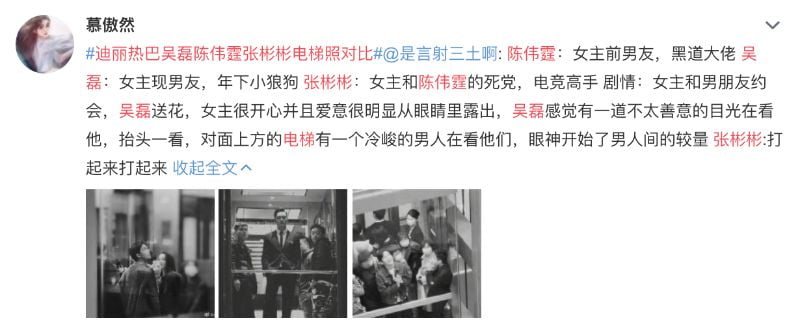 網友:「陳偉霆:女主前男友,黑道大佬;吳磊:女主現男友,年下小狼狗;張彬彬:女主和陳偉霆的死黨,電競高手。劇情:女主和男朋友約會,吳磊送花,女主很開心並且愛意很明顯從眼睛裏露出,吳磊感覺有一道不太善意的目光在看他,擡頭一看,對面上方的電梯有一個冷峻的男人在看他們,眼神開始了男人間的較量… 張彬彬:「打起來打起來!」