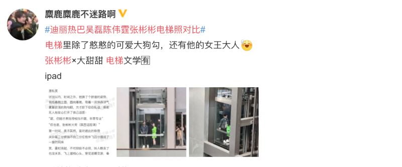 還有網友特地為張彬彬和景甜寫文的:「當然,電梯裏除了憨憨的可愛大狗勾,還有他的女王大人!張彬彬×大甜甜!電梯文學🈶」