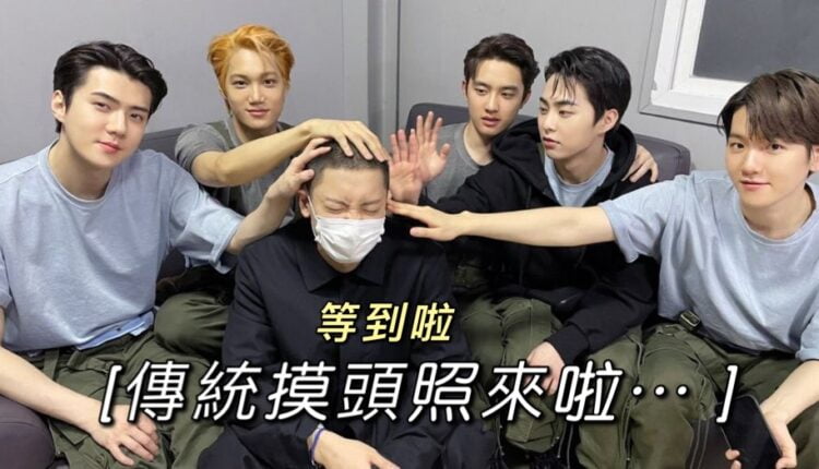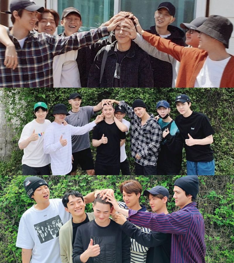 嗚哇!終於等到啦!!表示地球人都知道,每當有EXO成員入伍時,官方都會公開一張成員們的大合照,而標準手勢則是“摸頭”殺!