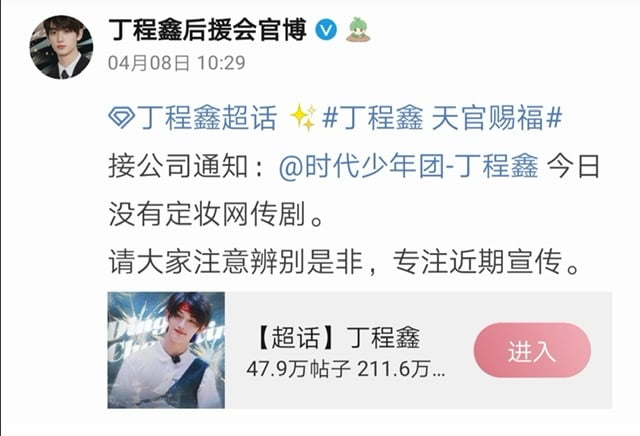 據報道,丁程鑫定妝的是《天官賜福》中的謝憐一角!不過官方後援會很快就發文否認:「接[公司通知]。今日沒有定妝網傳劇目,請大家注意辨別是非,專注近期宣傳。」