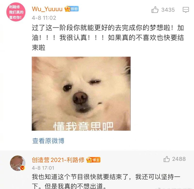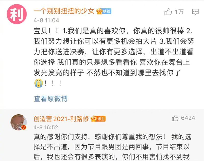 利路修:「真的感謝你們支持,感謝你們尊重我的想法! 我的選擇是不出道,因為節目跟男團是兩回事,節目結束以後,我也還會有很多表演的,你們不用害怕找不到我。」