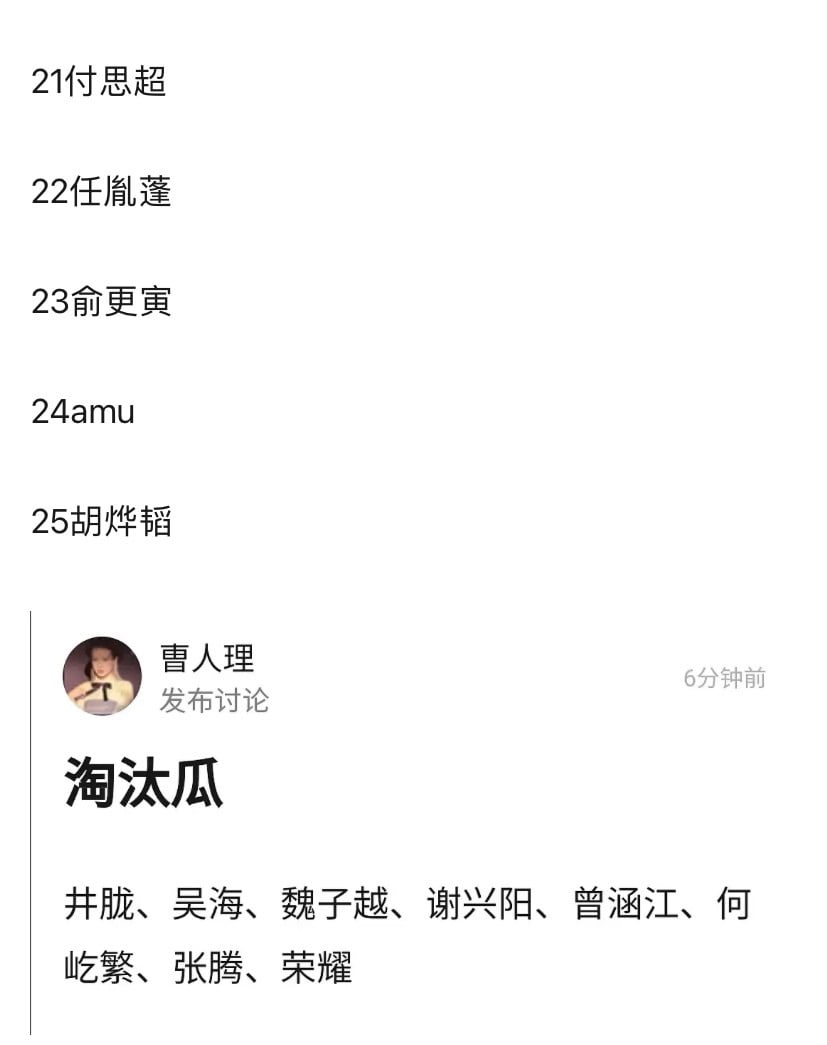 好!立刻來看看傳說中的排名瓜!第12至25名分別是:伯遠(第12)、AK劉彰(第13)、井汲大翔(第14)、甘望星(第15)、張星特(第16)、奧斯卡(第17)、薛八一(第18)、吳宇恆(第19)、張欣堯(第20)、付思超(第21)、任胤蓬(第22)、俞更寅(第23)、羽生田挙武(第24)和胡燁韜(第25)。淘汰的則有:井朧、吳海、魏子越、謝興陽、曾涵江、何屹繁、張騰、榮耀。