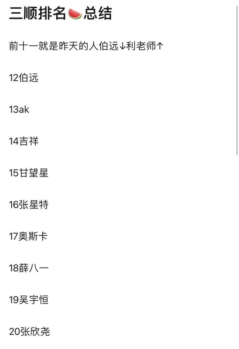 好!立刻來看看傳說中的排名瓜!第12至25名分別是:伯遠(第12)、AK劉彰(第13)、井汲大翔(第14)、甘望星(第15)、張星特(第16)、奧斯卡(第17)、薛八一(第18)、吳宇恆(第19)、張欣堯(第20)、付思超(第21)、任胤蓬(第22)、俞更寅(第23)、羽生田挙武(第24)和胡燁韜(第25)。淘汰的則有:井朧、吳海、魏子越、謝興陽、曾涵江、何屹繁、張騰、榮耀。