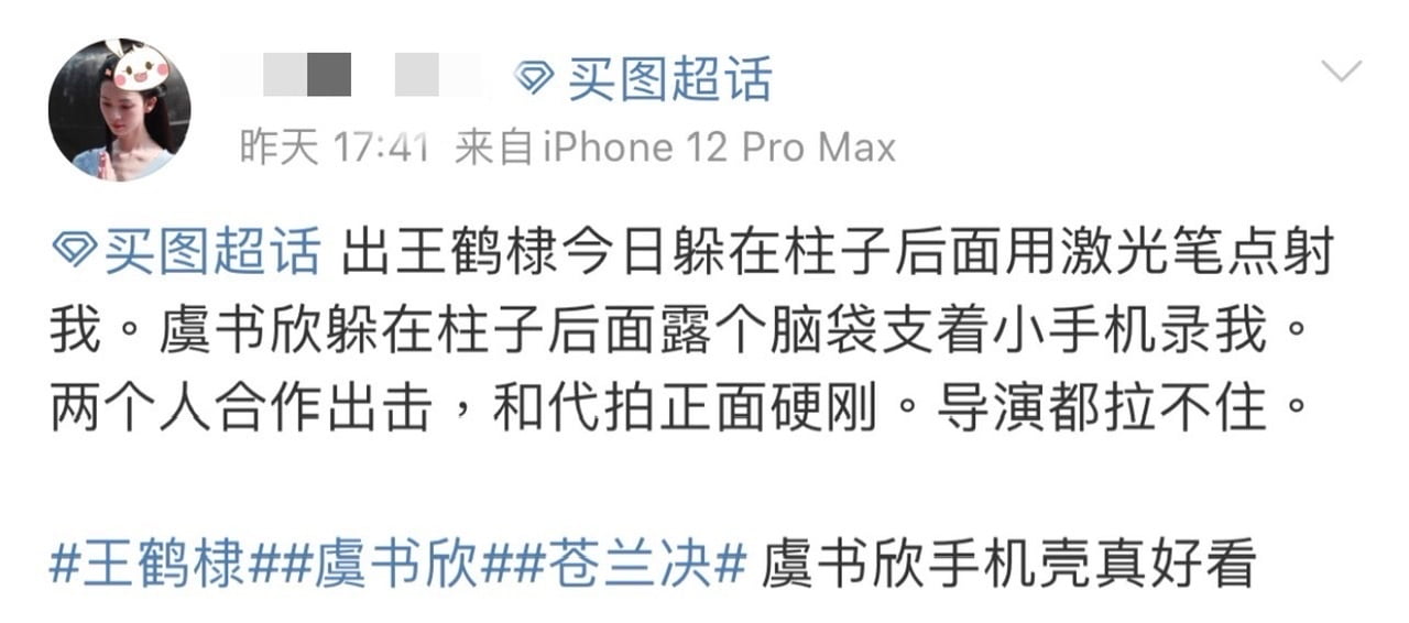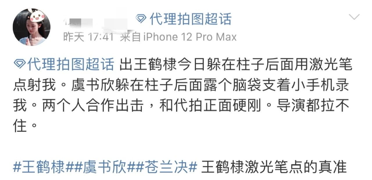 來看這個代拍怎麼形容當時的情景:「出王鶴棣今日躲在柱子後面用激光筆點射我。虞書欣躲在柱子後面露個腦袋支著小手機錄我。兩個人合作出擊,和代拍正面硬剛。 導演都拉不住。