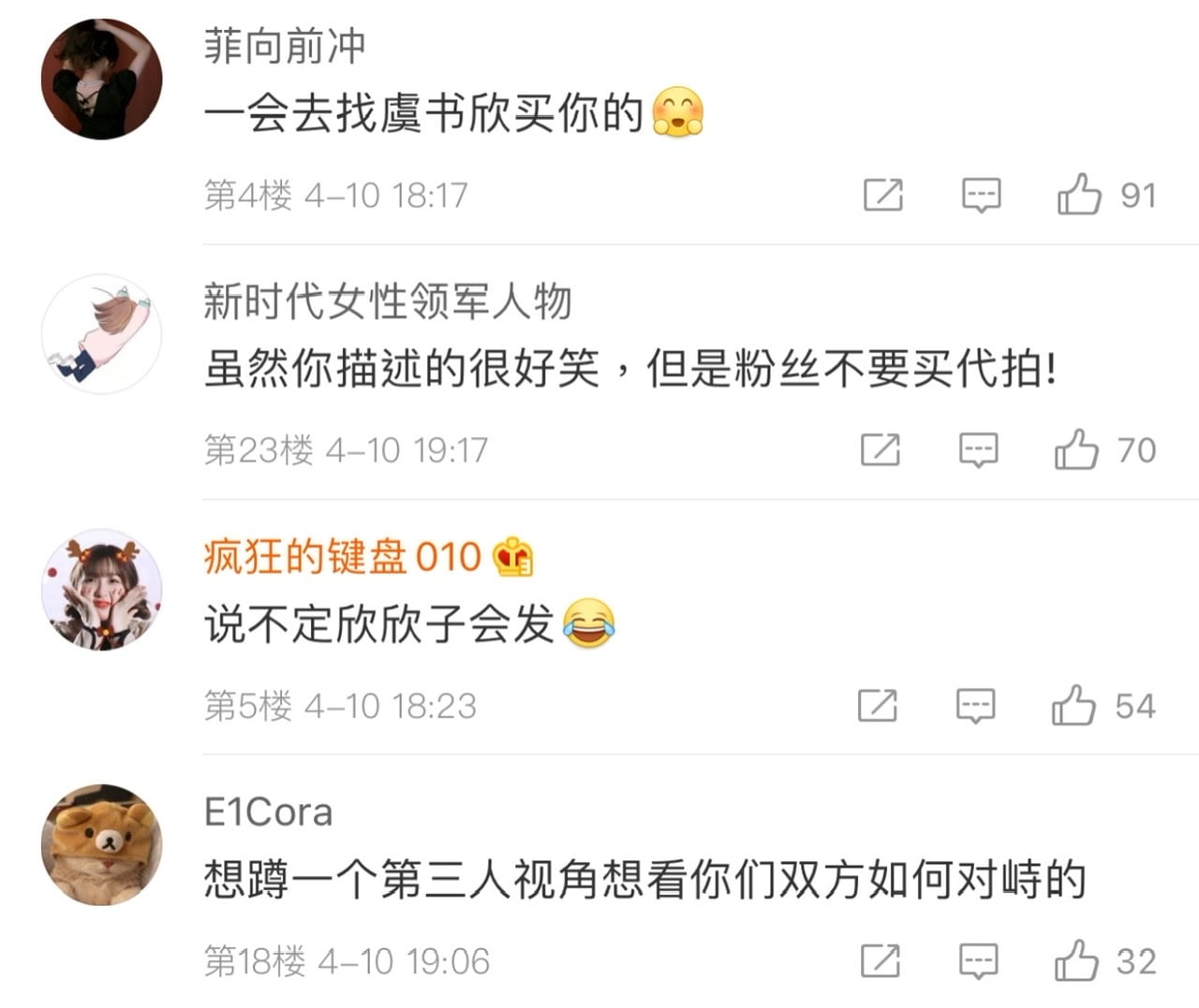 來看粉絲在代拍貼文下的回覆:「一會去找虞書欣買你的!」、「雖然你描述的很好笑,但是粉絲不要買代拍!」、「說不定欣欣子會發[笑cry]」、「想蹲一個第三人視角想看你們雙方如何對峙的!」