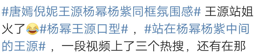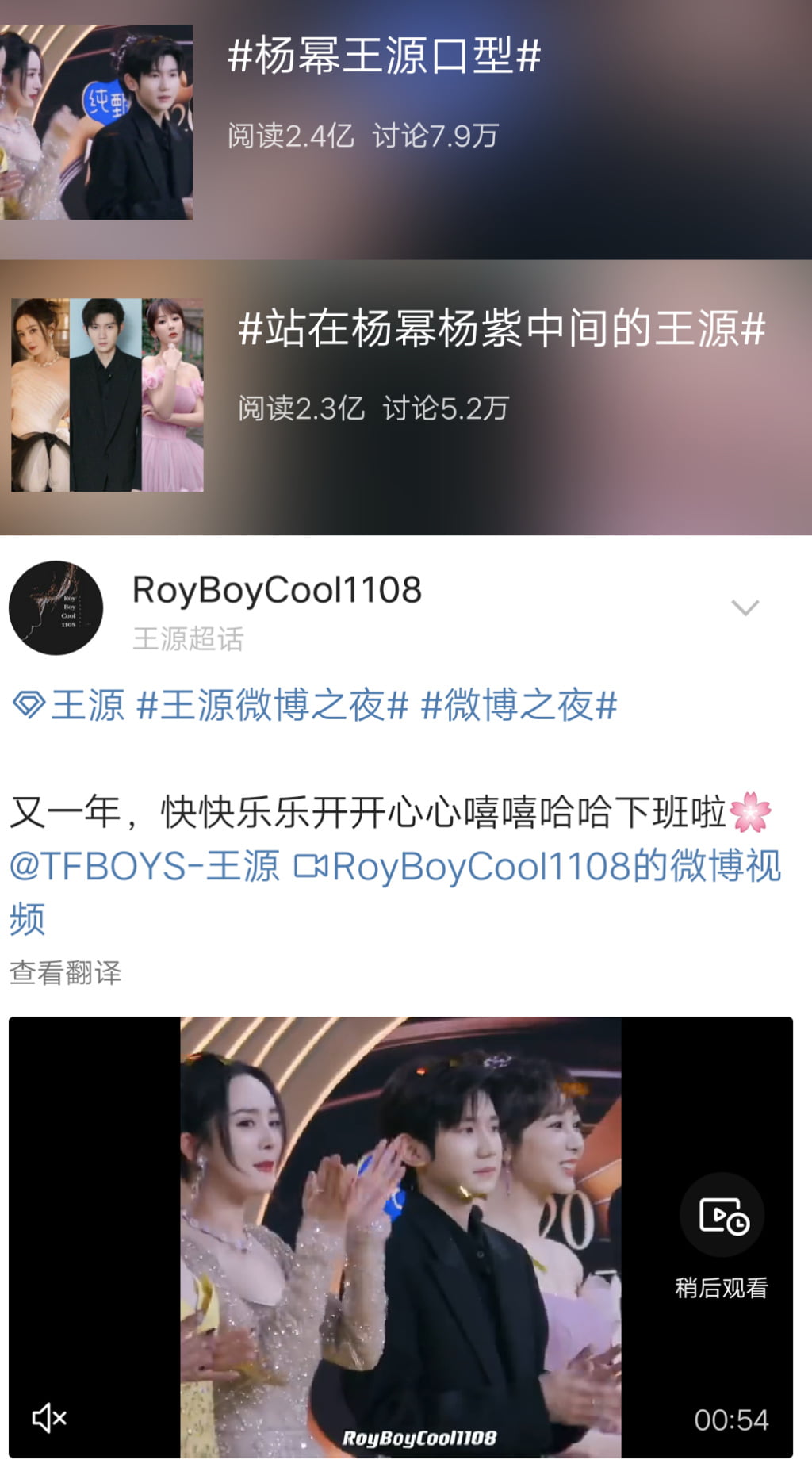 比如王源在《微博之夜》中,RBC站姐拍的王源站在楊紫和楊冪中間的一段視頻,就上了3個熱搜詞!