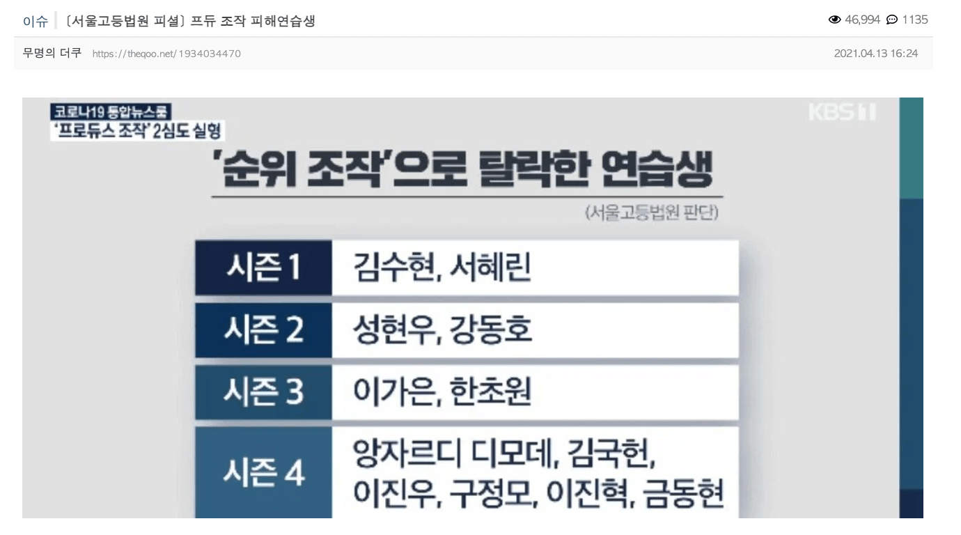 是的!!13號下午在韓網引起千樓熱議的話題,就是有關首爾高等法院公開因Mnet選秀節目《Produce》投票造假,而失去出道機會的練習生名單話題!究竟是誰的人生被偷走了呢?