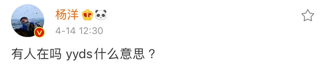 楊洋14號中午發文,詢問:「有人在嗎 yyds什麽意思? ​​​​」