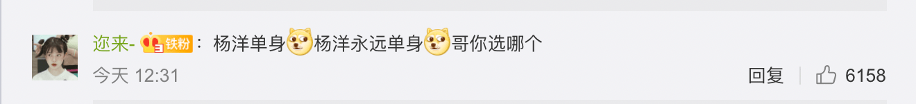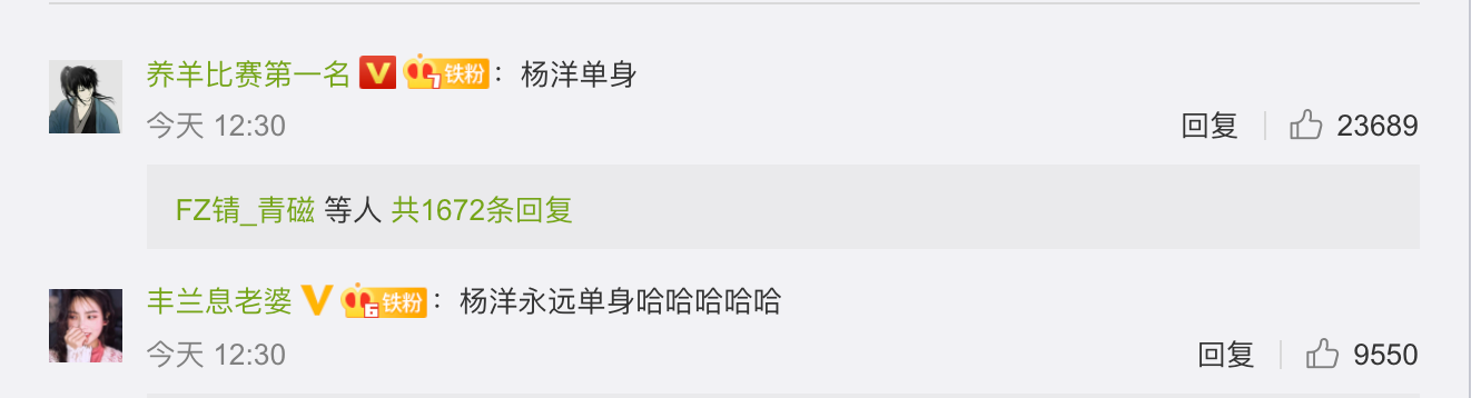 這就立刻來圍觀,究竟羊毛們怎麼回復咩總?熱評第一:「楊洋單身」、熱評第二:「楊洋永遠單身哈哈哈哈哈」