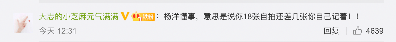 還有”記仇“的,立刻回復:「楊洋懂事,意思是說你18張自拍還差幾張你自己記著!!」