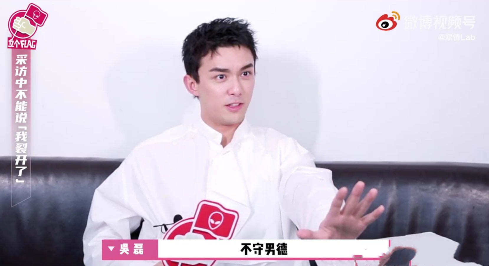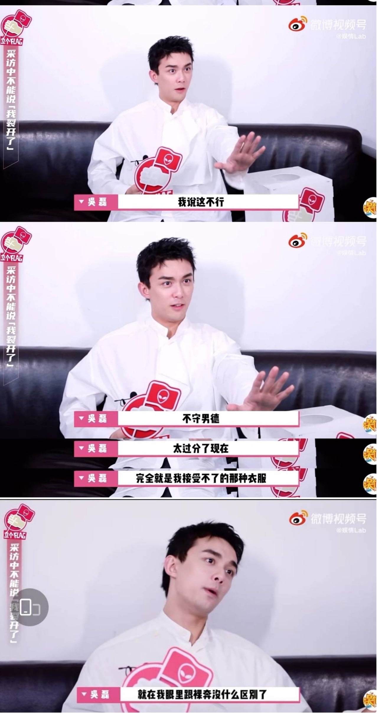 那吳磊怎麼回應造型師呢?他正氣凜然說:「我說這不行!不守男德!太過分了現在,完全就是我接受不了的那種衣服,在我眼裡就跟裸奔沒什麼分別了!」