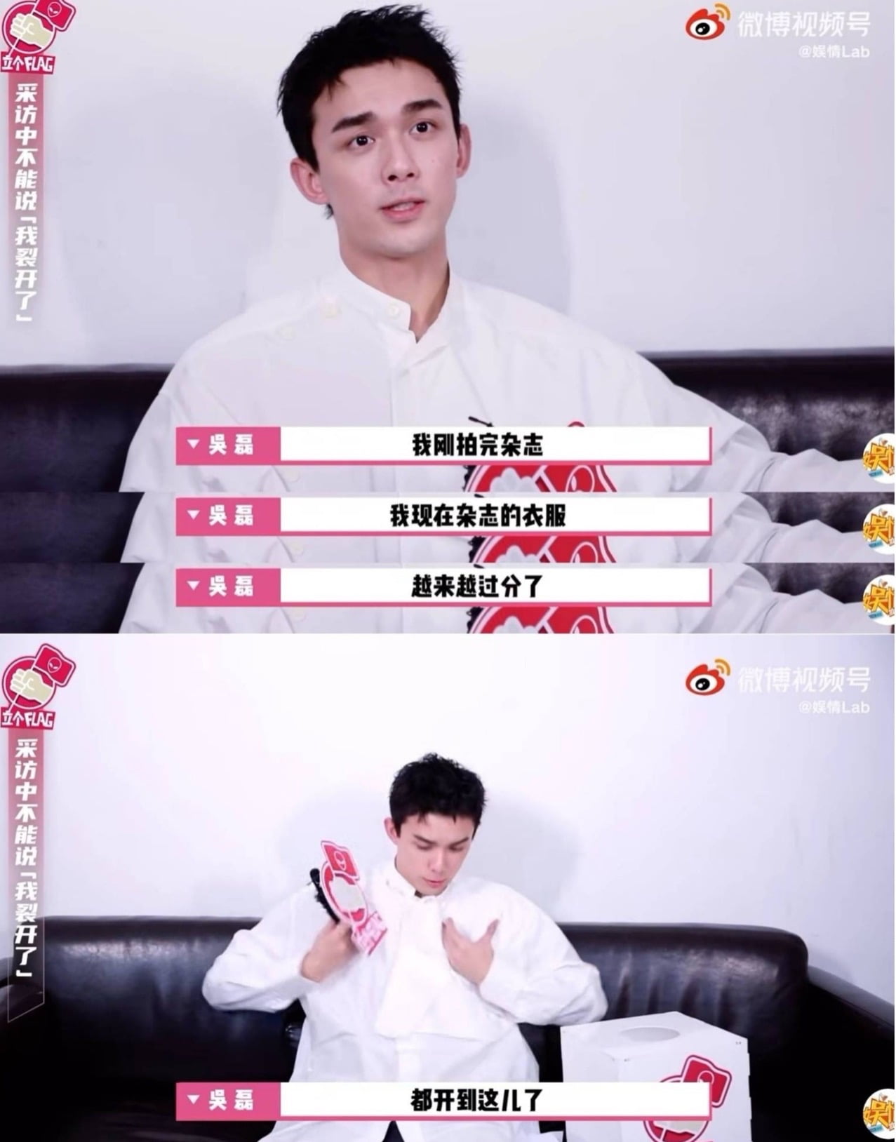 但這次訪問最搞笑的經典部分來了⋯吳磊控訴自己最近拍攝雜誌時,造型師準備的衣服實在太!過!分!了!「都開到這兒了!!!」他還用手在胸口前比劃了一下!