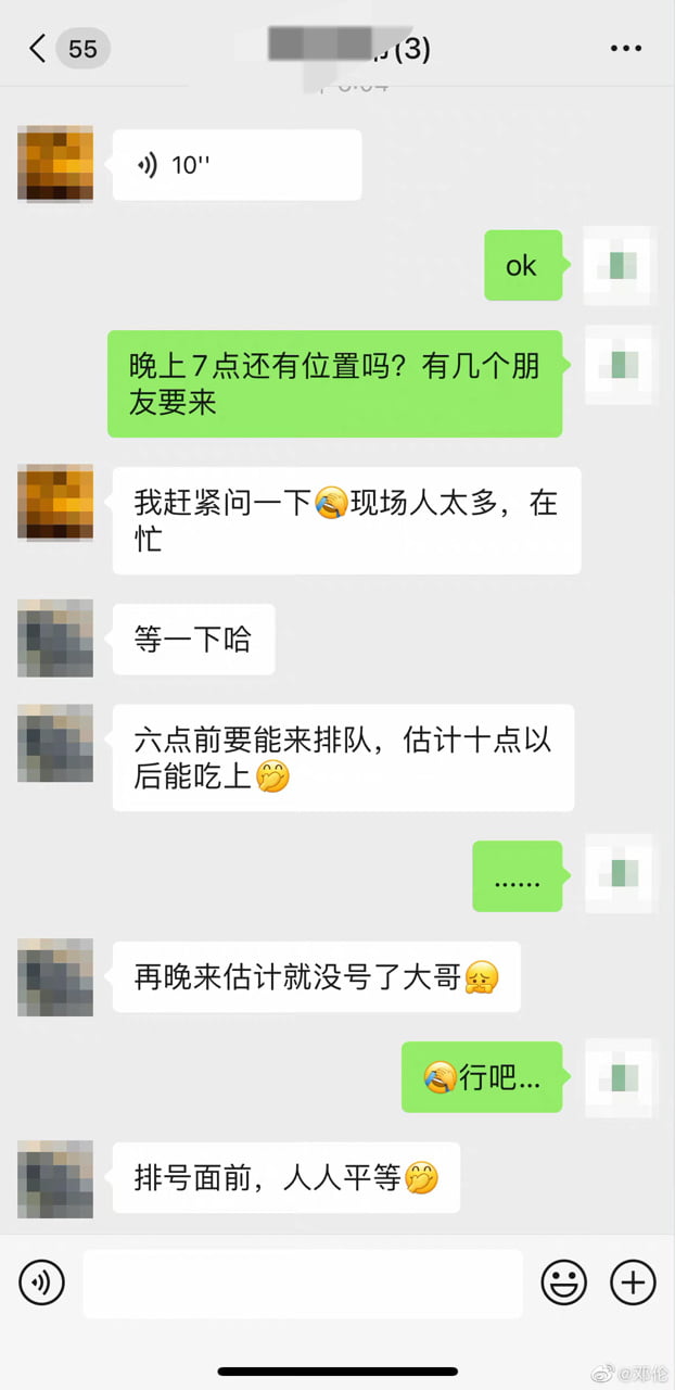 原來鄧倫本來打算安排位子給幾個朋友,結果皮下回覆的答案超官方,表示如果六點前來排隊,大概10點可以吃上,面對老闆的無語,還追加表示:「排號面前,人人平等!」面對員工如此官方的回覆,隔著螢幕都感受到老闆鄧倫的無言⋯