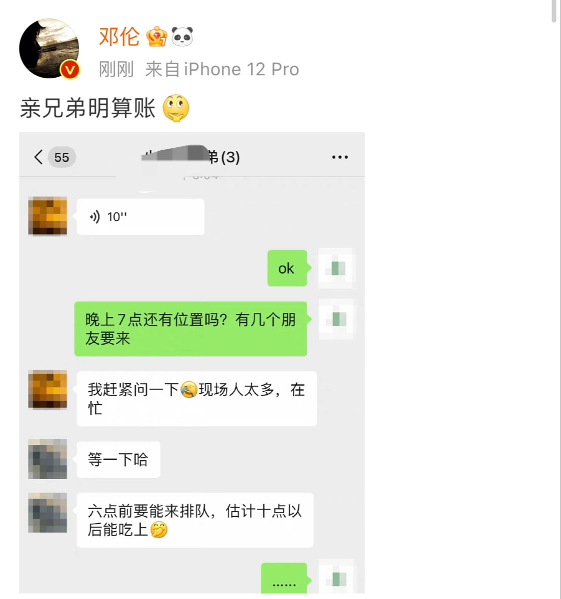 19號傍晚,身為老闆的鄧倫曬出了自己和火社火鍋店的對話,配文:「親兄弟 明算帳」