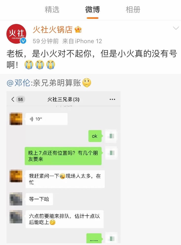 鄧倫發文之後,火社火鍋店立刻轉發回覆:「老闆,是小火對不起你,但是小火真的沒有號啊!」和前幾次的語氣相比,這次顯然受到教訓比較誠懇,大概擔心老闆又找更乖的下一個啦!