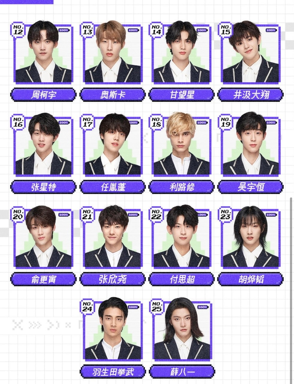先來看看排在第12-25名的學員,分別有:周柯宇(12)、奧斯卡(13)、甘望星(14)、井汲大翔(15)、張星特(16)、任胤蓬(17)、利路修(18)、吳宇恆(19)、俞更寅(20)、張欣堯(21)、付思超(22)、胡燁韜(23)、羽生田拳武(24)、薛八一(25)
