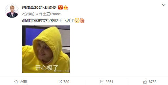 接著更新了微博,官宣:「謝謝大家的支持,我終於下班了!」開心到用自己的表情包,隔著螢幕也感受得到莉莉真的很開心!