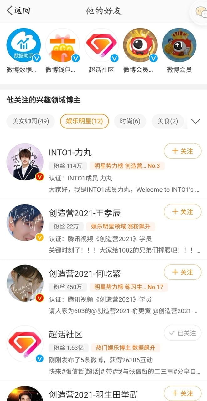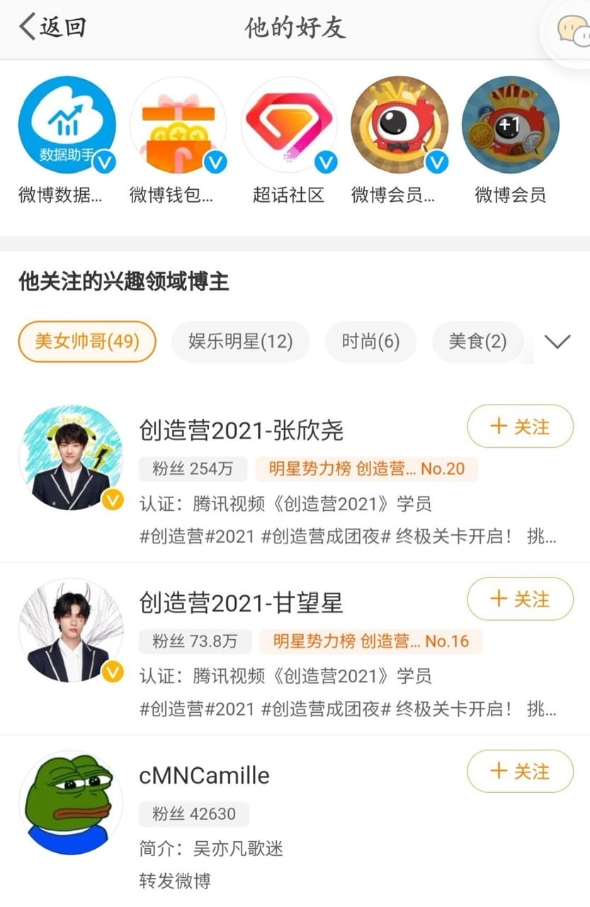 當中微博第一個關注的就是甘望星,還把好友甘望星和張欣堯歸類在「美女帥哥」類別,而其他學員則在娛樂明星組。
